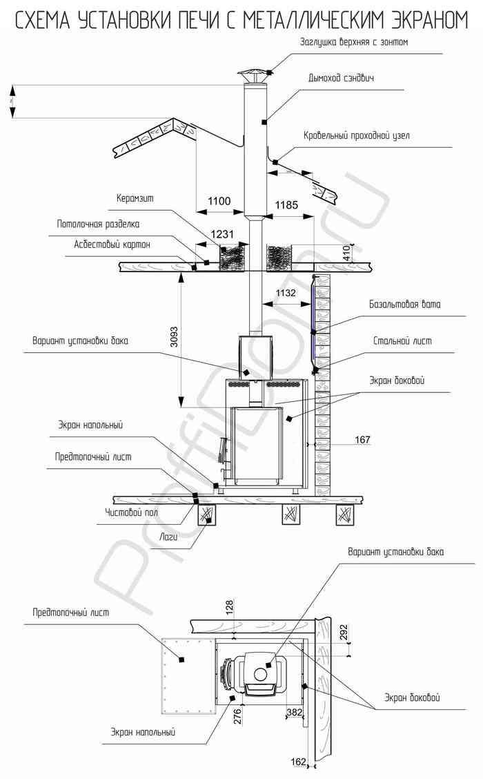 - пол перед дверцей покрывают стальным листом от 50х70 см. Длинной линией вдоль печки. Вокруг – стальной лист по асбестокартону на 150 мм больше габаритов корпуса;
