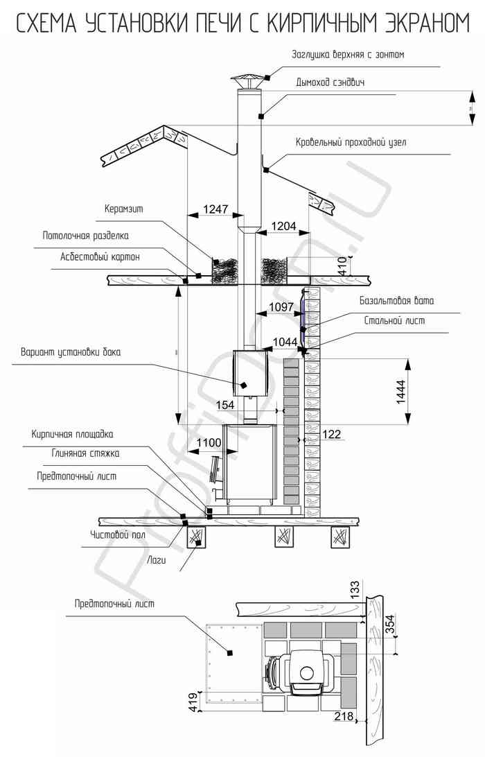 - расстояние до стен – до 20 см, под потолком над прибором – теплоизоляционный щит с расстоянием до обшивки не меньше 5 см.