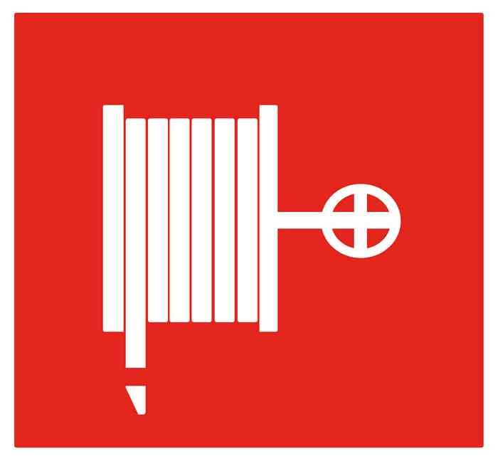 Графические обозначения внутреннего пожарного водоснабжения регламентируются ГОСТ 12.4.026-2015, НПБ 160-97. Используется знак «пожарный кран» (F02) – схематический рисунок брандспойта с вентилем в квадрате красного фона.