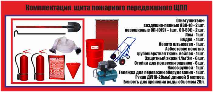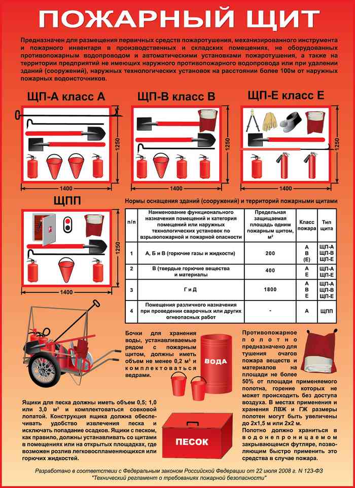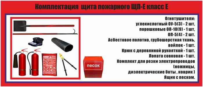 - на щите должен быть пожарный инвентарь и другого вида с параметрами, указанными в Прил. 6 ППР, ГОСТ 12.4.009-83.