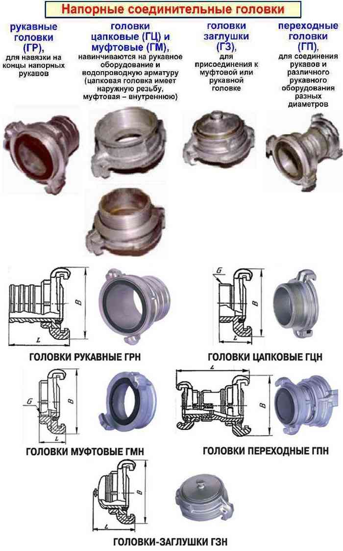 Основные виды пожарной соединительной арматуры описывает ГОСТ Р 53279. Помимо этого, различают конструкции Богданова, Ротта, Шторца.