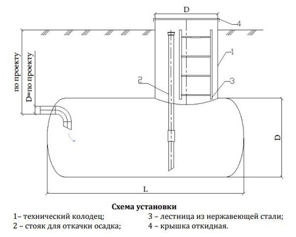 Днище конусообразное, выпуклое, плоское. Всегда есть ребра жесткости. Температура воды в резервуаре должна исключать замерзание (+5... +95 °C). Упрощенные варианты (пластик, стеклопластик): корпус с гидроизоляцией, технологическими патрубками, наверху – горловина для доступа с люком, лестницей, с техническим колодцем, стояком для откачки осадка.